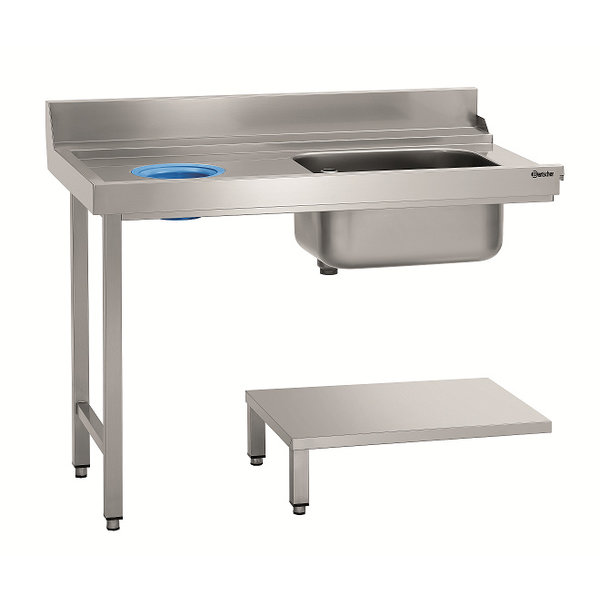 - De 1,2 brede voorreiniging met spoelbak en afvalschacht is ontworpen voor aanbouw aan de linkerkant van de Bartscher doorschuifvaatwasser DS. Een basisbodem biedt opbergruimte voor spoelkorven.