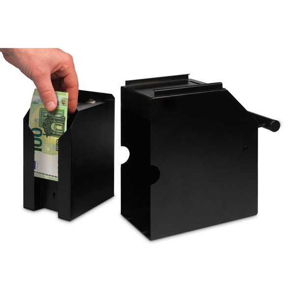 Je stopt een ontvangen bankbiljet in de gleuf, drukt de hendel omlaag en voilà: het biljet bevindt zich veilig in de Safescan afroomkluis. Aan het einde van de dag ontgrendel je de kluis, open je de interne cassette en haal je de gestapelde bankbiljetten eruit.