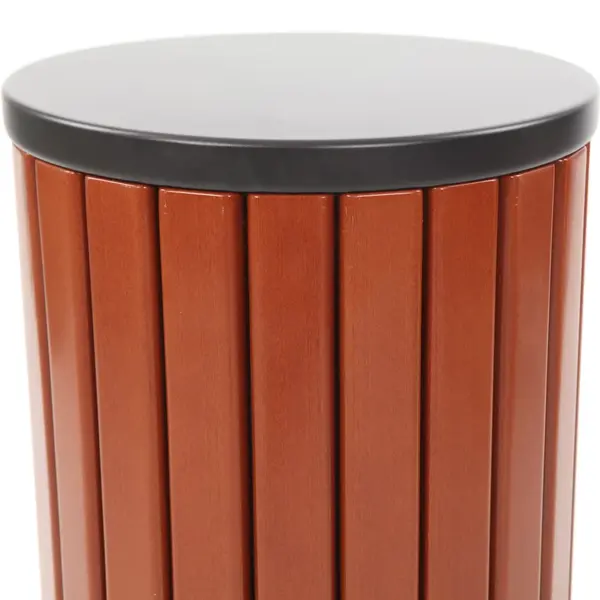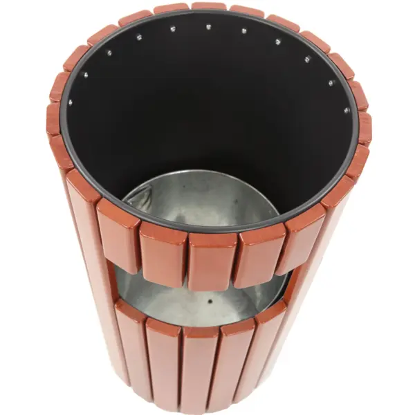 De ronde afvalbak bestaat uit een stalen frame met een houtlook afwerking, wat zorgt voor een stijlvolle en robuuste uitstraling. Binnenin is de afvalbak voorzien van een verzinkte binnenemmer.