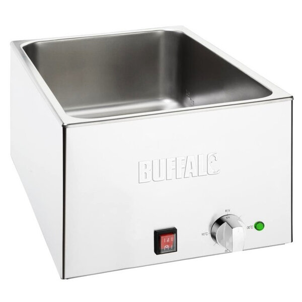 Deze Buffalo bain-marie is een duurzame en betrouwbare keuze voor professionele keukens en cateraars. Het apparaat heeft een krachtig verhittingselement met vermogen van 1200 Watt en capaciteit voor 1/1 GN met maximum hoogte van 150 mm.