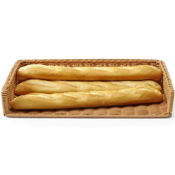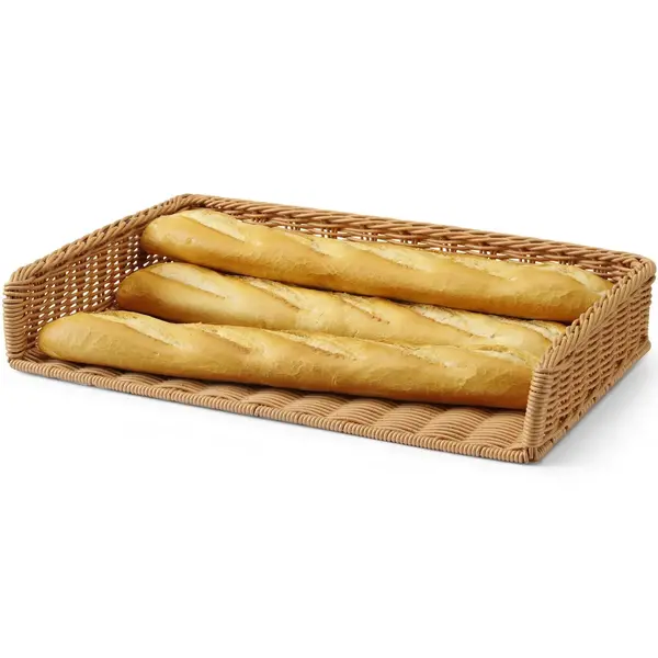 Deze HENDI broodmand is dankzij het royale formaat en de opening aan één zijde ideaal voor het presenteren van broodjes, baguettes en andere gebakjes in bakkerijen, supermarkten en op buffetten. Gemaakt van duurzaam polyrattan en extra verstevigd met een frame van hoogwaardig RVS, combineert de mand een natuurlijke uitstraling met stevigheid. De open zijde maakt het eenvoudig om brood te pakken, en de mand is gemakkelijk schoon te maken en geschikt voor de vaatwasser.