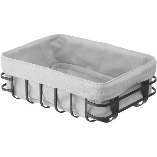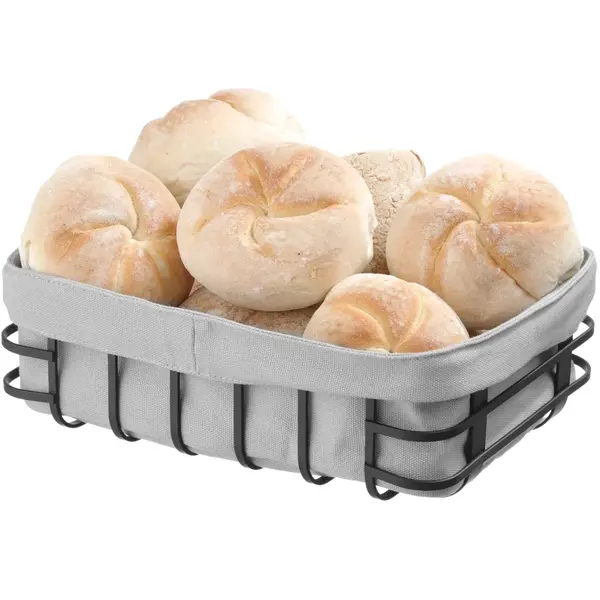 De rechthoekige broodmand van HENDI is afgewerkt met een matzwarte poedercoating en voorzien van een grijze, wasbare voering. Ideaal voor het serveren van brood, fruit of snacks in een strak en praktisch formaat.