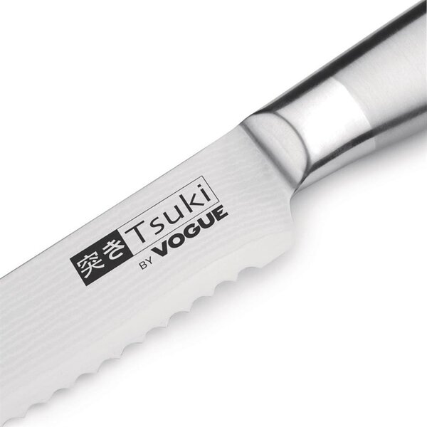 Snij moeiteloos brood met dit broodmes van Vogue TSUKI Series 8. Het mes is vakkundig gemaakt, met een Japanse VG-10-RVS-kern met een hardheid van Rockwell 60 waardoor het mes zeer duurzaam is. Dit gebalanceerde en geslepen mes van Vogue TSUKI is een professioneel mes en perfect voor koks van ieder niveau. Het heft biedt een comfortabele grip. Vogue TSUKI-messen staan bekend om hun duurzame kwaliteit, dus dit mes is een perfecte aanvulling op jouw messencollectie.