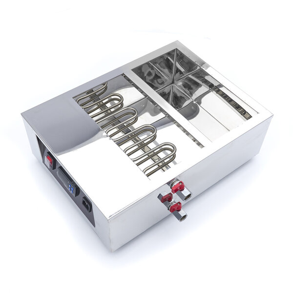 Deze chocoladesmelter maakt het mogelijk om chocolade langzaam en gelijkmatig te smelten met de au bain marie methode. De temperatuur is nauwkeurig instelbaar in kleine stappen, waardoor verbranding van chocolade wordt voorkomen. Het apparaat is vervaardigd uit roestvrij staal, wat corrosie tegengaat en het schoonmaken vergemakkelijkt. De chocoladesmelter is uitgerust met een waterbassin en twee 1/3 GN containers met een diepte van tien centimeter. Het bedieningspaneel heeft een aan-/uitknop en een digitaal display voor eenvoudige temperatuurinstelling. Aan de zijkant bevinden zich twee afvoeren: een waterafvoerkraan en een stoomafvoerklep, die het afvoeren van water en stoom veilig en gemakkelijk maken. Door de constante temperatuur en het gebruik van de au bain marie methode wordt de chocolade op een zachte manier gesmolten, wat klonteren voorkomt zolang de chocolade niet in contact komt met water. Na gebruik is het apparaat eenvoudig schoon te maken dankzij de roestvrijstalen behuizing en accessoires.