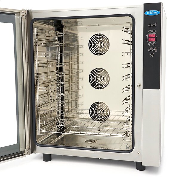 Deze combisteamer combineert hete lucht en stoom om vlees, vis en groenten te bereiden waarbij vitaminen, smaak en kleur langer behouden blijven. Het apparaat is geschikt voor 1/1 GN-bakken of bakplaten van 60 x 40 cm en biedt ruimte voor tien bakken tegelijk. De combisteamer is uitgerust met krachtige roestvrijstalen verwarmingselementen en drie ventilatoren met omkeerfunctie voor een gelijkmatige warmteverdeling. Het digitale display met tiptoetsen maakt het mogelijk om temperatuur, stoomniveau en tijd nauwkeurig in te stellen. Er zijn meerdere vooraf ingestelde programma's met drie fasen die aanpasbaar zijn en opgeslagen kunnen worden. Het apparaat is eenvoudig schoon te maken dankzij de roestvrijstalen behuizing met afgeronde hoeken en de binnenverlichting zorgt voor goed zicht tijdens het kookproces. De stoomproductie wordt geregeld via een watertoevoer met ventiel en er is een waterafvoer aanwezig.