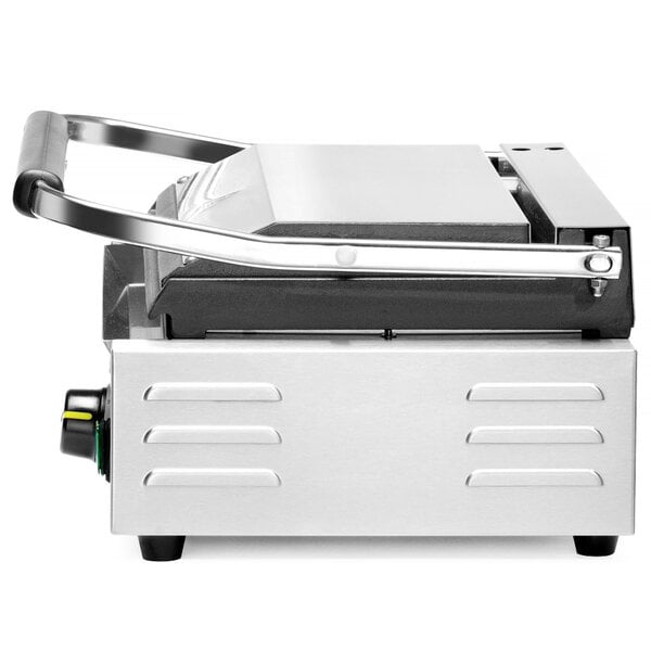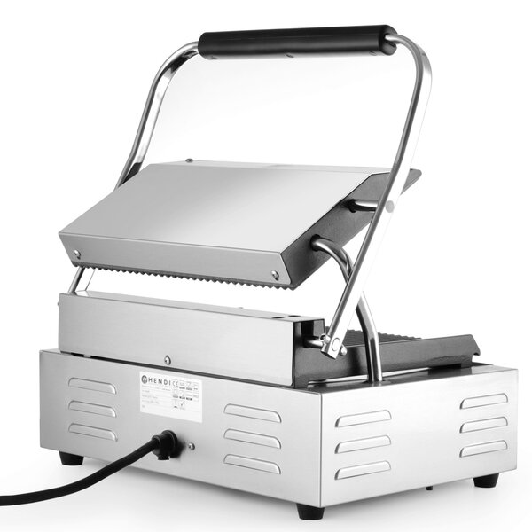 Deze professionele contact-/paninigrill van HENDI met enkele grill combineert een compact formaat met een krachtig vermogen. De grill is uitgevoerd met gladde grillplaat onder en gegroefde grillplaat boven, welke beide zijn uitgevoerd in gietijzer met geëmailleerde afwerking, voor optimale warmteverdeling en eenvoudig reinigen en onderhouden.
