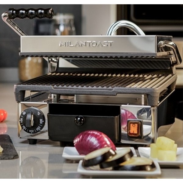 Professionele contactgrill met gietijzeren platen die voorzien zijn van een speciale keramische coating en eenvoudig te reinigen. Gemakkelijk in gebruik dankzij de in hoogte en druk verstelbare bovenplaat. Het grillen van diverse gerechten zoals sandwiches en steaks is mogelijk dankzij de snelle opwarming, uitstekende warmtebehoud en uniforme temperatuur dankzij de roestvrijstalen verwarmingselementen. Uitgerust met geribbelde bovenplaat, geribbelde onderplaat en vetafvoer met opvanglade.