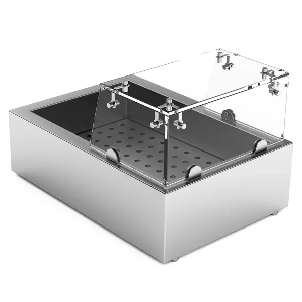 De open bak is uitgevoerd in hoogwaardig RVS met geborstelde afwerking en heeft een capaciteit voor 1x 1/1 GN-formaat. Deze uitvoering heeft een rechte rand met afvoeraansluiting aan de bedieningskant en kan eenvoudig op een bestaand (werk)oppervlak worden geplaatst.