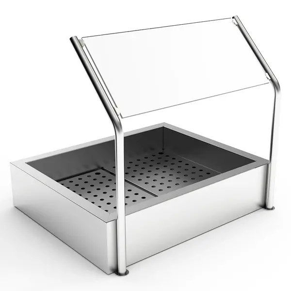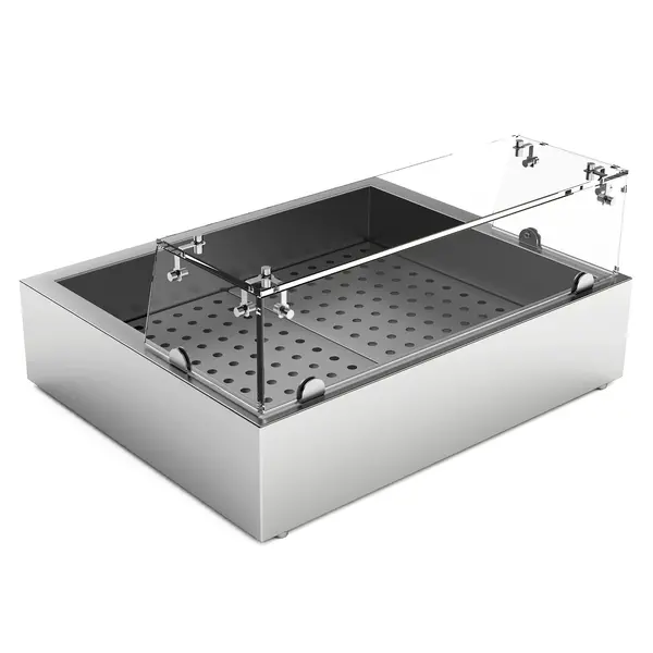 De open bak is uitgevoerd in hoogwaardig RVS met geborstelde afwerking en heeft een capaciteit voor 2x 1/1 GN-formaat. Deze uitvoering heeft een rechte rand met afvoeraansluiting aan de bedieningskant en kan eenvoudig op een bestaand (werk)oppervlak worden geplaatst.