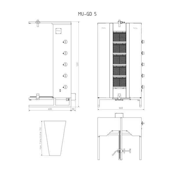 Dönergrill | SERIE MU | Gas | 5 Branders | 14kW (5x 2.8kW) | Max. 120kg | Rotatiemotor Onder (Achter) | 670x750x1220(h)mm