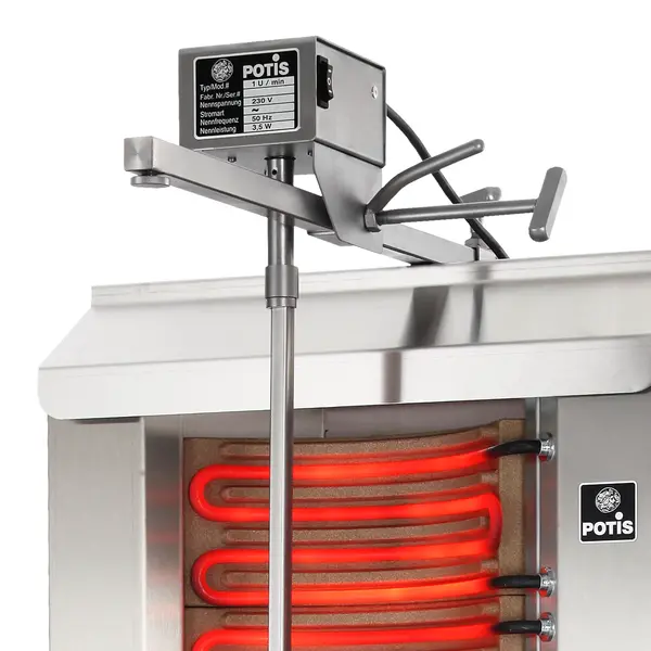 Deze dönergrill uit de STANDARD-serie van Potis - hét merk voor apparatuur voor bereiding van o.a. döner, shoarma en gyros - heeft een behuizing van hoogwaardig RVS en is uitgevoerd met de rotatiemotor aan de bovenkant. Dit zorgt dat het spit zich zo dicht mogelijk op het werkoppervlak bevindt waar de grill op is geplaatst.