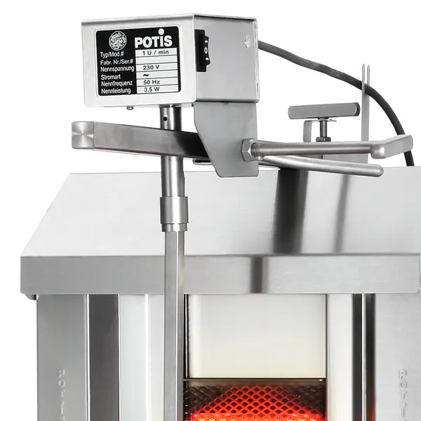 Deze dönergrill uit de STANDARD-serie van Potis - hét merk voor apparatuur voor bereiding van o.a. döner, shoarma en gyros - heeft een behuizing van hoogwaardig RVS en is uitgevoerd met de rotatiemotor aan de bovenkant. Dit zorgt dat het spit zich zo dicht mogelijk op het werkoppervlak bevindt waar de grill op is geplaatst.