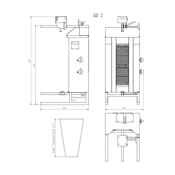 Bovendien zijn er diverse accessoires en toebehoren voor de Potis STANDARD dönergrills beschikbaar, zoals een ombouwset voor propaangas, zijschermen en dönerscheppen in verschillende formaten!
