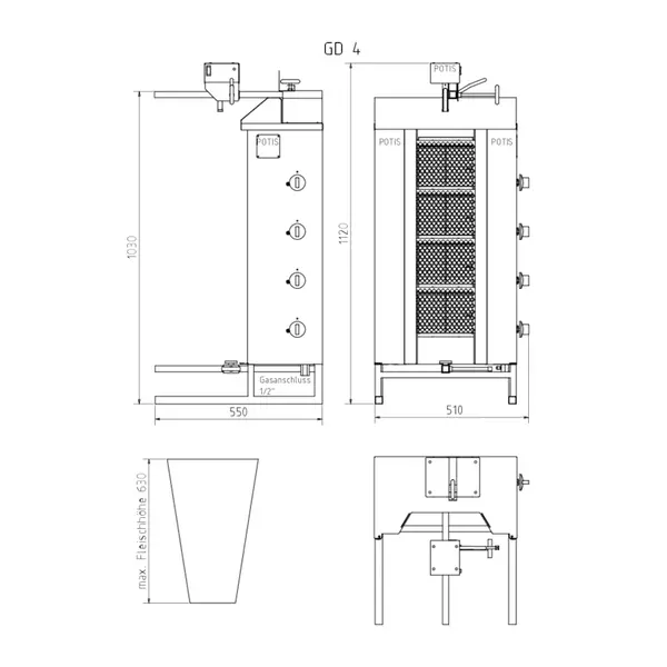 Dönergrill | STANDARD | Gas | 4 Branders | 11.2kW (4x 2.8kW) | Max. 70kg | Rotatiemotor Boven | 550x740x1120(h)mm