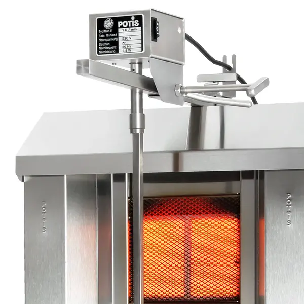 Deze dönergrill uit de STANDARD-serie van Potis - hét merk voor apparatuur voor bereiding van o.a. döner, shoarma en gyros - heeft een behuizing van hoogwaardig RVS en is uitgevoerd met de rotatiemotor aan de bovenkant. Dit zorgt dat het spit zich zo dicht mogelijk op het werkoppervlak bevindt waar de grill op is geplaatst.
