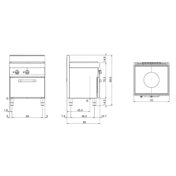 In de onderkast is een statische oven op gas verwerkt met krachtig brandervermogen van 5 kW, piëzo-ontsteking en roosterformaat van 530 x 530 mm (incl. 1 ovenrooster). Verder heeft de gasoven eenvoudige thermostatische temperatuurcontrole met temperatuurbereik van 150°C/300°C, welke kan worden bediend met de stevige hittebestendige draaiknoppen.