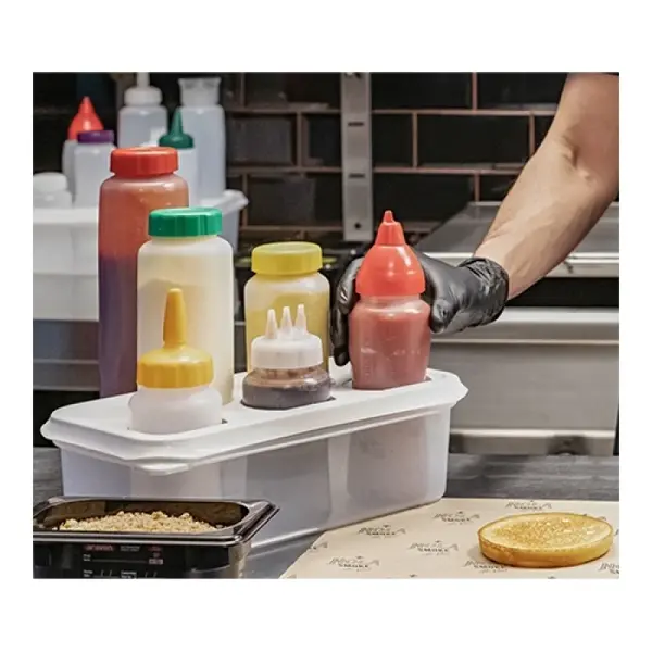 De doseerflessen-organizer van Araven zorgt voor een nette en overzichtelijke presentatie van sauzen en dressings. Het praktische ontwerp houdt de flessen stabiel en binnen handbereik, waardoor het perfect is voor keukens, werkstations en buffetten. De organizer heeft een 1/3 GN-maat en beschikt over 5 gaten met een diameter van 60 mm, zodat de flessen stevig op hun plek blijven. Gemaakt van polypropyleen, is de organizer BPA-vrij, koudbestendig tot -40°C en hittebestendig tot 95°C, waardoor hij geschikt is voor uiteenlopende keukenomstandigheden.