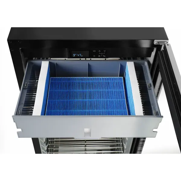 De UVC-lamp in het interieur zorgt voor een antibacterieel effect, wat belangrijk is voor een goed dry ageing proces. Het speciale 'Low-E' glas in de deur zorgt bovendien voor significant minder koudeverlies en daardoor hoge energie-efficiëntie.