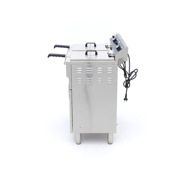 Deze robuuste dubbele frituurpan werkt op 230 volt en heeft twee aparte stekkers, waardoor hij geschikt is voor diverse keukens, foodtrucks en frietzaken. Elke frituurpan heeft een oliecapaciteit van maximaal dertien liter, wat het mogelijk maakt om veel friet tegelijk te bakken. De frituurpan is voorzien van een dubbele kast die zorgt voor een comfortabele werkhoogte en biedt opbergruimte. Onder elke olietank bevindt zich een aftapkraan met filter om kruimels tegen te houden, wat het afvoeren van oude olie eenvoudig maakt. Dankzij de koude zone verbranden etensresten niet, waardoor de olie langer schoon blijft. De temperatuur is instelbaar tussen zestig en tweehonderd graden Celsius met een draaiknop, en de frituurmanden zijn gemaakt van roestvrij staal. Voor het reinigen kunnen de manden in de vaatwasser, hoewel de handgrepen met de hand gewassen worden om beschadiging te voorkomen. De olietanks en losse onderdelen kunnen met warm water en een mild schoonmaakmiddel worden gereinigd zonder schuursponsjes te gebruiken. Deze dubbele frituurpan is ideaal voor het snel en efficiënt bereiden van snacks.
