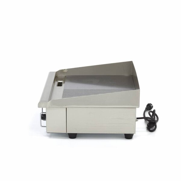 Deze elektrische grillplaat is een robuust en handzaam apparaat met een grilloppervlak van 55 cm. Het grilloppervlak is verdeeld in een gegroefd en een glad gedeelte, waardoor je voedsel gelijkmatig kunt garen en sappig houdt. De gegroefde zijde voert sappen en vetten af, terwijl de gladde zijde ideaal is voor delicate producten zoals vis en groente. De grillplaat is vervaardigd van roestvrij staal en voorzien van spatschermen die oliespetters voorkomen. Het vet wordt opgevangen in een roestvrijstalen opvangbak onder de plaat. De temperatuur is instelbaar met een draaiknop en kan variëren van 50 tot 300 graden Celsius. De grillplaat is beveiligd tegen oververhitting en staat stabiel dankzij rubberen voeten. Dankzij het snelle opwarmen en afkoelen is de grillplaat eenvoudig schoon te maken. Hardnekkig vuil kan worden verwijderd door het oppervlak te verwarmen en met water en een mild schoonmaakmiddel schoon te maken. De losse accessoires zijn eenvoudig te reinigen en terug te plaatsen.