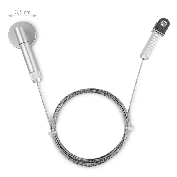 Let op, dit product betreft alleen de staalkabel voor plafond-ophangbord-bevestiging met montagepunten; voor het aanbrengen van informatiedragers zijn bijpassende houders apart verkrijgbaar.
