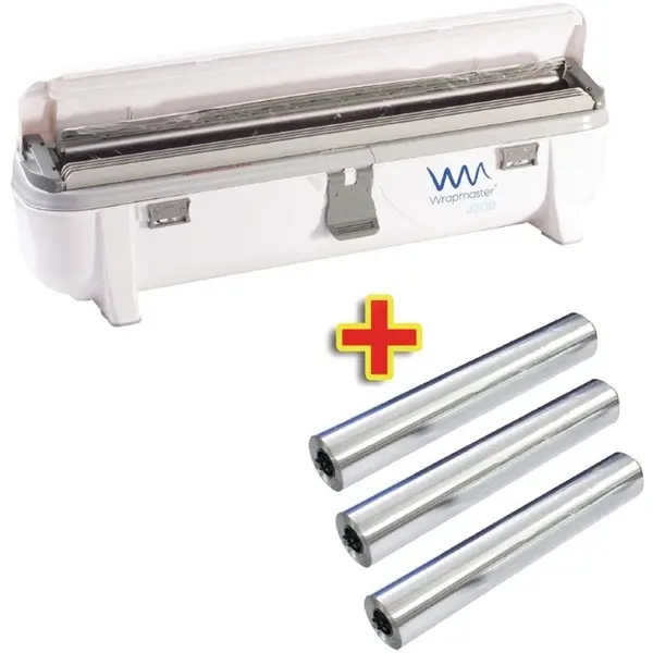 De Wrapmaster 4500 foliedispenser helpt je om je voedselbereiding sneller en efficiënter te maken. Dankzij het veilige snijmes en de eenvoudig te reinigen buitenkant gebruik je hem moeiteloos in een drukke, commerciële keuken. Bij deze speciale aanbieding krijg je de dispenser samen met 3 rollen folie (bijna 900 voet) voor een voordelige prijs. Met afneembare voeten, een afsluitbaar deksel en vaatwasmachinebestendigheid tot 80°C is hij zowel hygiënisch als praktisch. De afmetingen zijn 145 mm hoog, 520 mm breed en 150 mm diep, met een gewicht van 1,42 kg. De dispenser is compatibel met Wrapmaster vershoudfolie (M810), braadfolie (GH029) en bakpapier (GM214).