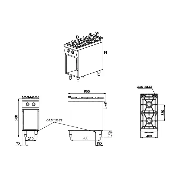 Fornuis | BASE 900 | Gas | 2 Branders (2x 8.5kW) | Waakvlam | Open Onderkast | 400x900x900(h)mm