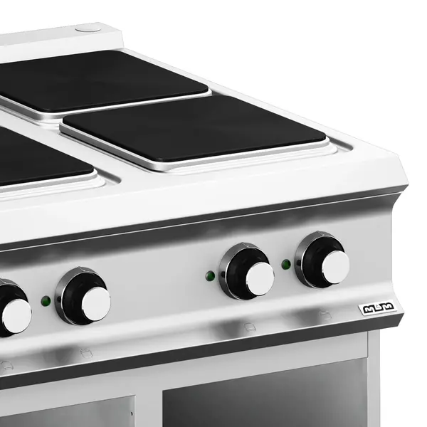 Dit staande elektrische fornuis op open onderstel heeft een behuizing in hoge kwaliteit RVS, beschikt over 6 verhoogde vierkante kookpunten van 300 x 300 mm, die waterdicht in het oppervlak zijn verwerkt.