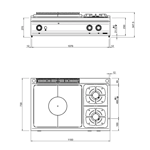 Fornuis/Doorkookplaat | OPTIMA 700 | Gas | 2 Branders (2x 7kW) + Plaat (10kW) | Waakvlam/Piëzo | 1100x700x250/320(h)mm