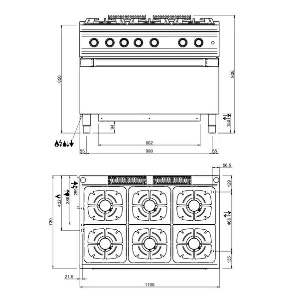 Fornuis + Maxi Oven | OPTIMA 700 | Gas | 6 Branders (6x 7kW) + Oven (8kW) | Waakvlam/Piëzo | 1100x700x850/920(h)mm