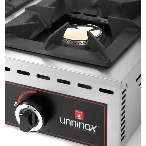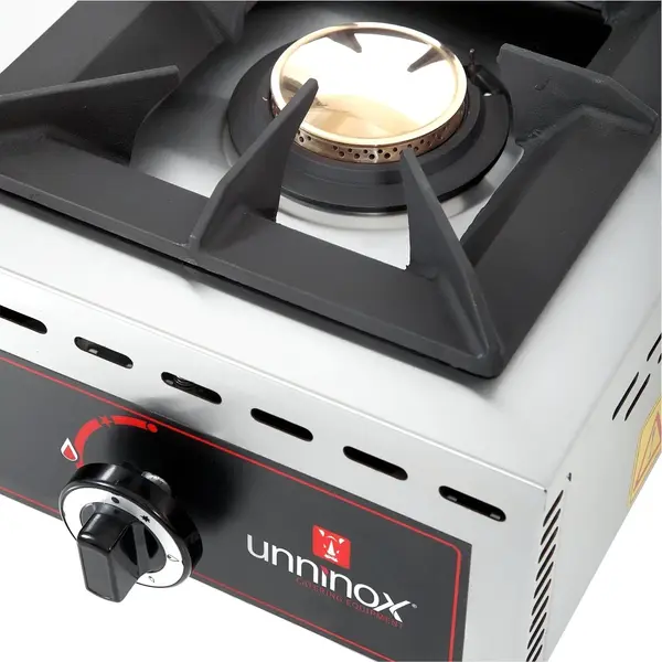 Dit lage tafelmodel gasfornuis van UNNINOX is volledig vervaardigd uit RVS en heeft 1 krachtige brander van vernikkeld gietijzer met een vermogen van 7 kW (zéér hoog rendement). De brander is eenvoudig instelbaar met een stevige draaiknop.