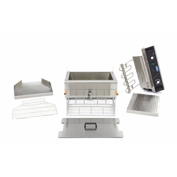 Deze professionele frituurpan is ideaal voor het bereiden van grote hoeveelheden voedsel in horecakeukens zoals bakkerijen en viszaken. Met een inhoud van twintig liter kun je grote porties oliebollen, vis, frites en snacks efficiënt frituren. De friteuse beschikt over twee instelbare verwarmingselementen en een thermostaat waarmee je de temperatuur tussen vijftig en tweehonderd graden Celsius regelt. Een indicatielampje geeft aan wanneer de olie op temperatuur is. Het compacte tafelmodel is voorzien van een ingebouwde tapkraan die het verwisselen van olie eenvoudig maakt. De friteuse heeft een afneembaar deksel om oliespatten te voorkomen en een koude zone waardoor de olie langer goed blijft. De bescherming tegen overbelasting zorgt voor veilig gebruik. Alle onderdelen zijn uitneembaar en gemaakt van roestvrij staal, wat het schoonmaken vergemakkelijkt. De friteuse werkt op krachtstroom.