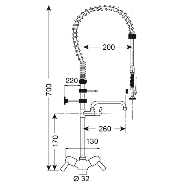 Gastro-Inox monobloc voorspoeldouche met draaihendels/zwenkkraan | Totale hoogte 700mm | Vechroomd koper