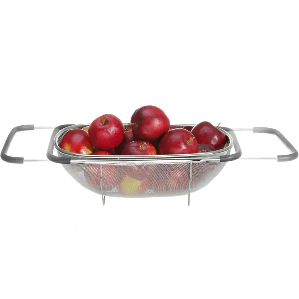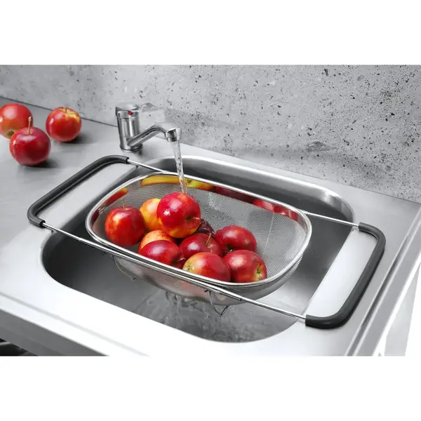 Het gootsteenvergiet van HENDI is een praktisch keukenhulpmiddel dat zich eenvoudig aanpast aan verschillende gootsteenformaten dankzij de uittrekbare handgrepen. Volledig vervaardigd uit hoogwaardig RVS, met fijnmazige structuur, is dit vergiet ideaal voor het spoelen van fruit, groenten en kruiden. De rubberen antislip handgrepen zorgen voor stabiliteit, terwijl de steunen aan de onderzijde het vergiet stevig in de spoelbak houden. Dankzij het slimme ontwerp blijft het vergiet op zijn plaats en is het comfortabel in gebruik.