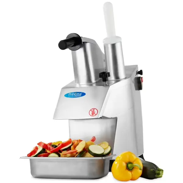 De machine werkt op één snelheid van maximaal 270 RPM en wordt aangedreven door een 550 W motor op 230V. De groentesnijmachine is voorzien van twee invoermogelijkheden: een halfronde doorvoer met hendel voor grotere producten en een ronde doordrukker van Ø5 cm voor kleinere of langere ingrediënten. Standaard wordt het apparaat geleverd met twee snijschijven van 2 en 4 mm en drie raspen van 3, 4 en 7 mm, waarmee diverse snijtoepassingen direct mogelijk zijn.
