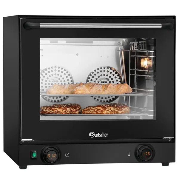 Deze praktische heteluchtoven uit de Bartscher SERIE AT is voorzien van draaiknoppen en daarop strak weggewerkte digitale displays met traploze temperatuurselectie en memory-functie voor eenvoudig instellen, en heeft een nette opwarmtijd (ca. 8 min. tot 150°C). De dubbele beglazing in de deur zorgt ervoor dat tijdens het gebruik de buitenkant van de deur relatief koel blijft. Verder geeft de oven een signaal wanneer de ingestelde tijd van de timer is verstreken.