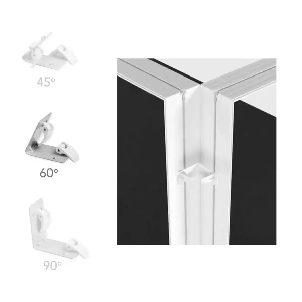 Deze hoekconnector is speciaal gemaakt om de Luxus LUMIX™ en LUMIX™ PRO LED-frames bij een opstelling in een hoek van 60° aan elkaar te kunnen verbinden.