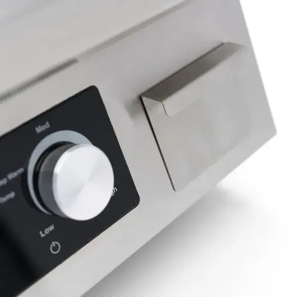 Bediening is eenvoudig via een draaiknop met 3 temperatuurstanden (Low, Medium, High), met een digitaal display dat de actuele temperatuur toont. Tijdens het opwarmen staat de grillplaat in de stand ‘Heating’ en schakelt automatisch over naar ‘Keep warm’ zodra de gewenste temperatuur is bereikt. Na 4 uur schakelt de grillplaat automatisch uit voor extra veiligheid en energiebesparing.