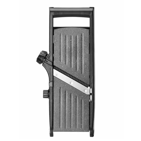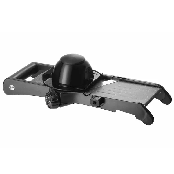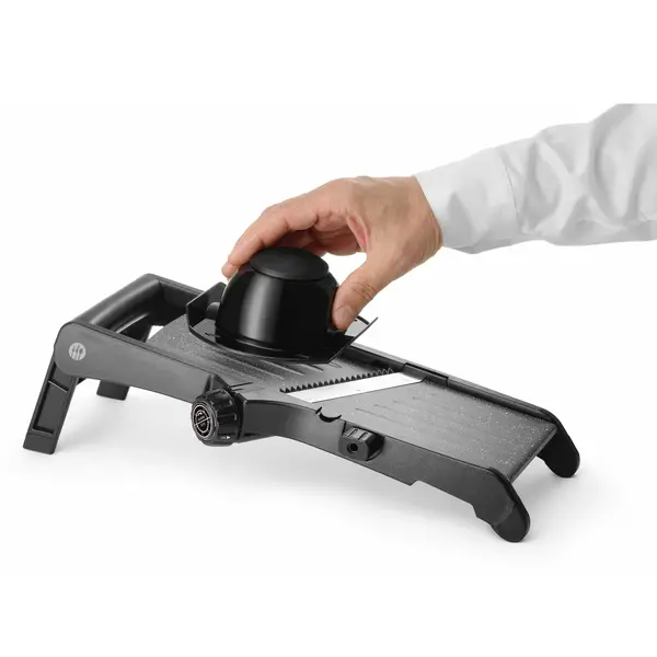 Door de inklapbare voet en komuitsparing kan de mandoline zowel vrijstaand als op een kom of schaal worden gebruikt, of zelfs in de hand, voor optimale flexibiliteit. De komuitsparing en poten zijn daarbij bekleed met antisliprubber (TPR), voor extra grip.