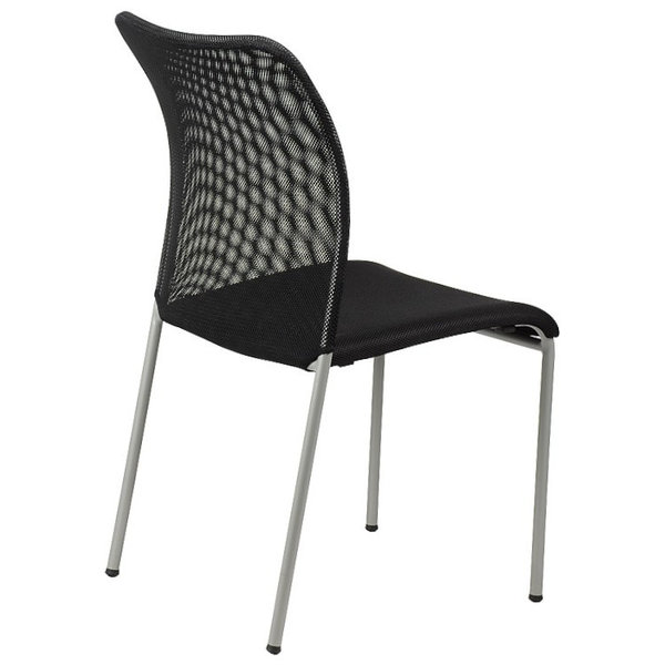 De HOUSTON stapelbare kantoorstoel van Luxus heeft een super licht metalen frame met grijze afwerking, gespannen mesh rugleuning en zachte gestoffeerde zitting.