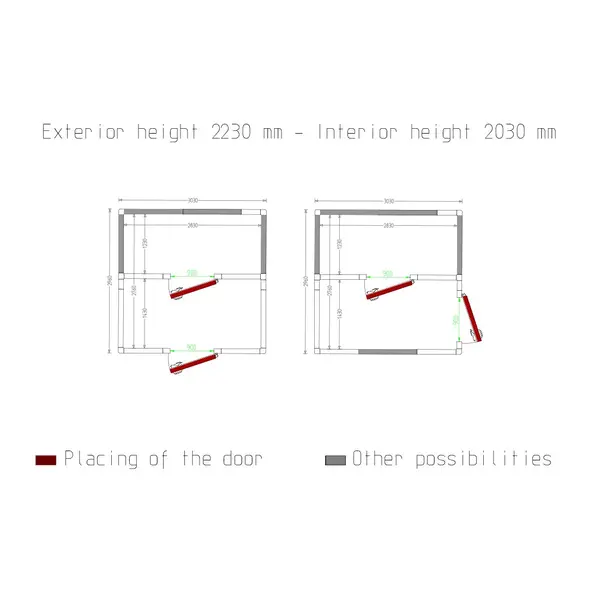 De klapdeur is voorzien van dezelfde isolatie als de wanden, heeft een geanodiseerd aluminium kozijn, magnetische sluiting, deurstop op 100°, stevige externe handgreep met slot, interne sluiting met veiligheidsvoorziening tegen insluiten en wordt standaard rechts scharnierend geleverd, maar op aanvraag is links scharnierend ook mogelijk.