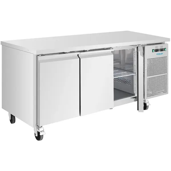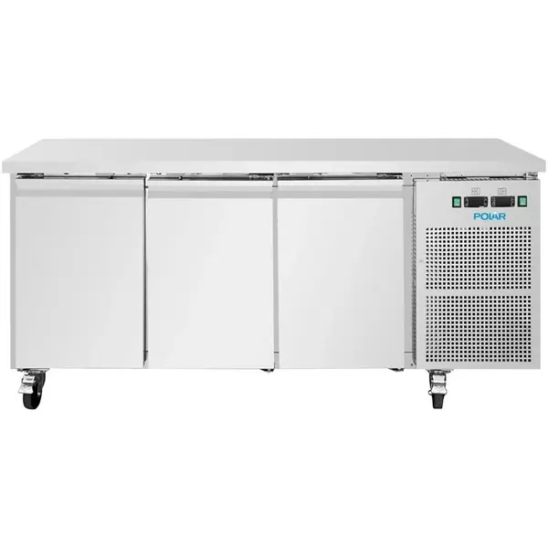 De Polar U-SERIE koel-/vrieswerkbank met 3 deuren is een krachtige prepareercounter die flexibiliteit en efficiëntie combineert in een compact apparaat voor drukke professionele keukens. Zeer efficiënt met energieklasse C, beschikt deze werkbank over krachtige geforceerde luchtkoeling, zelfsluitende deuren en automatische ontdooifunctie, waardoor de operationele kosten worden verlaagd en een constante temperatuur wordt gehandhaafd.