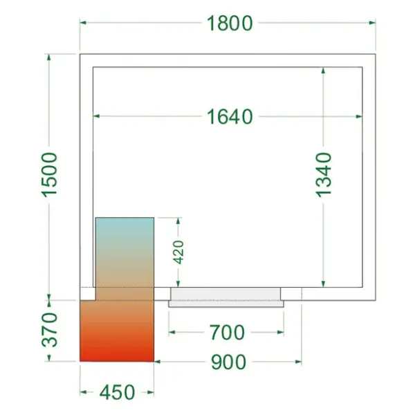 Binnenafmetingen: B 1640 x D 1340 x H 2040 mm