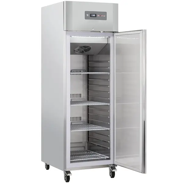 Deze RVS koelkast van Diverso by Diamond heeft een bruto inhoud van 600 liter en wordt geleverd met 3 verstelbare roosters in 2/1 GN-formaat en een bodemrooster. Het apparaat is voorzien van geforceerde koeling met een temperatuurbereik van -2°C/+8°C en automatische ontdooiing en condenswaterverdamping.