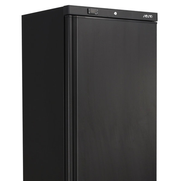 Deze zwarte koelkast van Saro heeft een bruto inhoud van 600 liter en wordt geleverd met 4 verstelbare roosters met een formaat van 3x 654 x 525 mm + 1x 654 x 330 mm. Het apparaat is voorzien van statische koeling met ventilator met een temperatuurbereik van -2°C/+8°C en automatische ontdooiing.