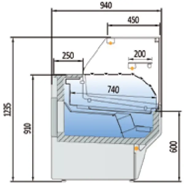 De binnen- en buitenzijde zijn uitgevoerd in kunststofgecoat staal, met een werkblad en displaygedeelte in RVS (AISI-304). Het geharde, kantelbare frontglas vergemakkelijkt het schoonmaken. Standaard is de toonbank voorzien van energiezuinige LED-verlichting (4000K), optioneel verkrijgbaar in 3000K of 'Fresh Red' kleur.