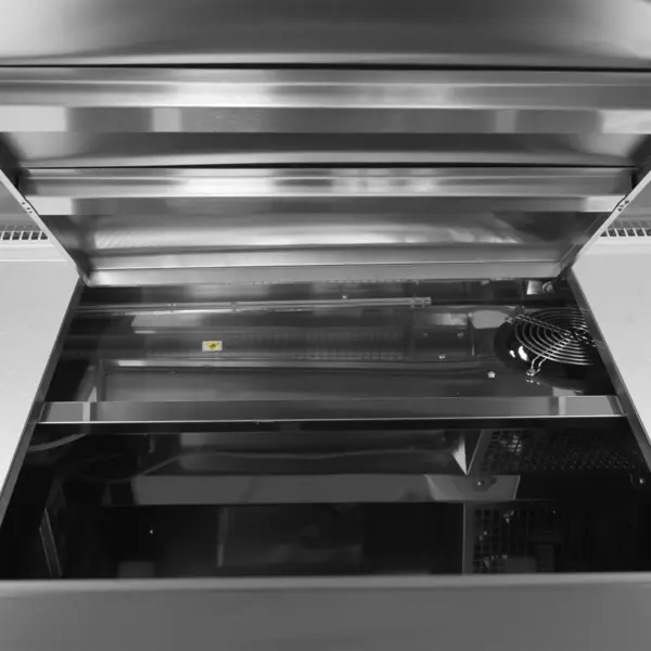 De koeltoonbank is gemakkelijk schoon te maken dankzij de binnenzijde van hoogwaardig RVS en de scharnierende glaspanelen aan de voorkant die naar voren openen, voor betere toegang tot de etaleerruimte. Aan de voorkant bevindt zich daarnaast een speciale stootrand voor extra bescherming.