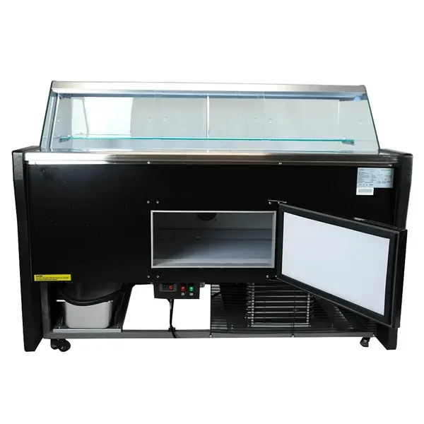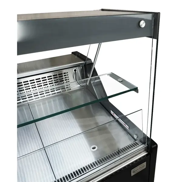 Het grote glasoppervlak, de interne LED-verlichting en het opstelvlak in hoogwaardig RVS zorgen dat de uitgestalde producten optimaal in het oog springen en door de gekoelde reserve aan de bedieningskant is de etaleerruimte eenvoudig bij te vullen wanneer nodig.