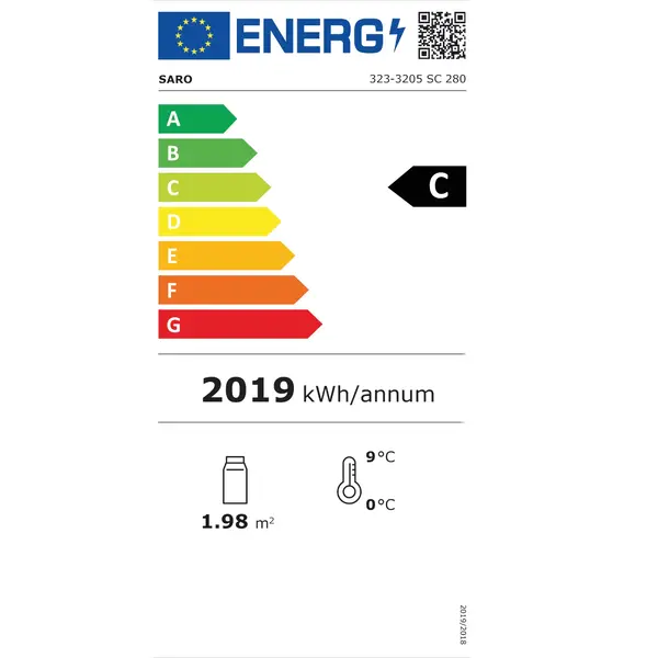 De koelvitrine is geclassificeerd onder energielabel C, een relatief zuinige categorie, en maakt gebruik van het milieuvriendelijke koelmiddel R600a.