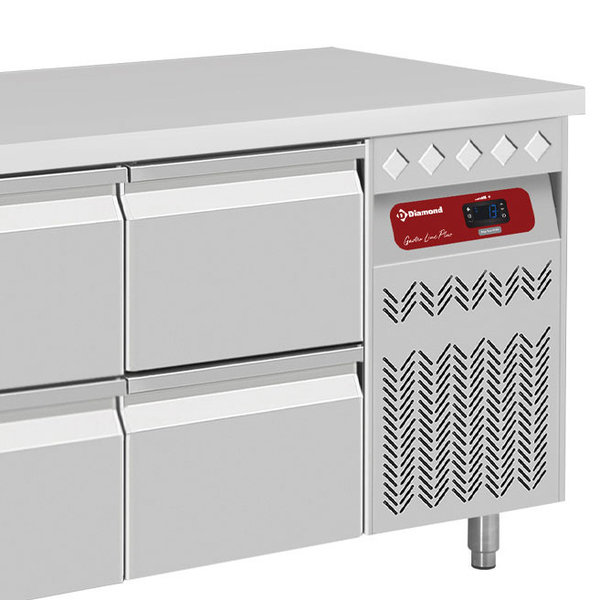 Overige eigenschappen: Diepgetrokken achterkant en afgeronde hoeken binnen (eenvoudig reinigen), afneembaar werkblad, laden met blinde handgrepen, getropicaliseerde condensator, koelunit frontaal toegankelijk (eenvoudig onderhoud), behandelde verdamper (zouten/voedingszuren), werkblad in voedingsveilig RVS